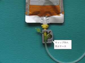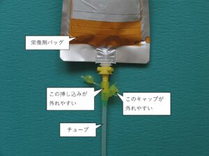 在宅介護では、介護者が要介護者に胃ろうをしなくてはいけません。胃ろうは栄養剤バッグとチューブを接続し、そのバッグを加圧して栄養剤をチューブを通して供給します。その圧力でチューブ付属のキャップが外れたり、チューブ自体がバックから外れる場合があります。解決策として、チューブのキャップが外れないためのケースと差し込んだチューブが外れないためのケースを作り、2つを合体し固定できるようにしました。