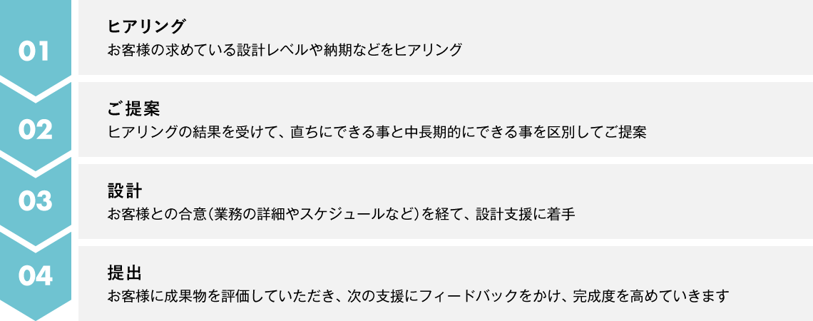 業界不問で構想設計から詳細設計まで対応します。製品固有の知識が必要となりますので、アイテムによっては事前準備期間が必要となります。
